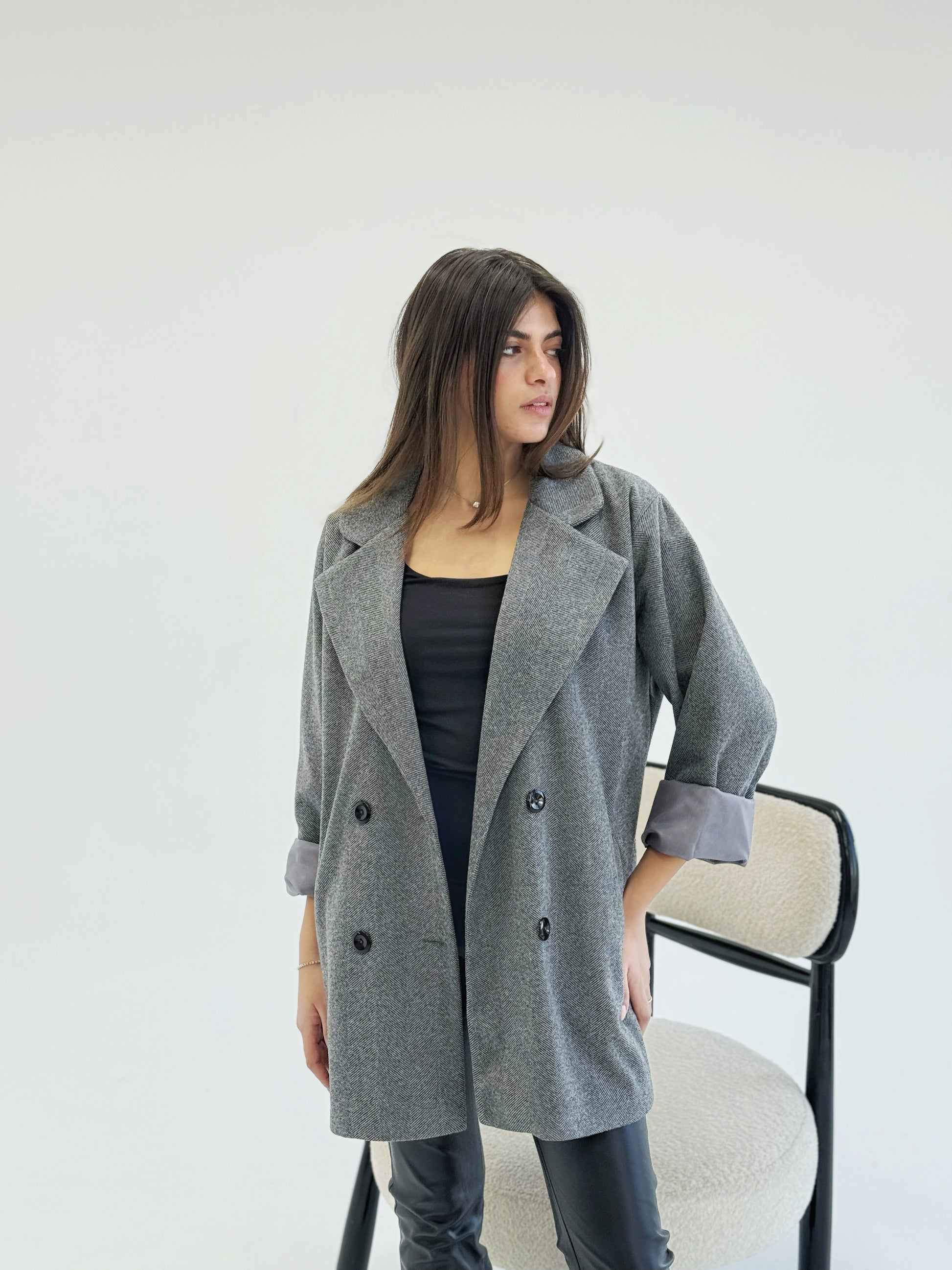 Oversized gray jacket with black buttons